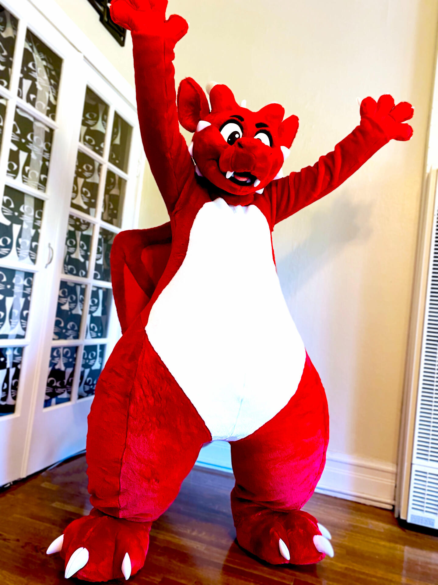 Most pieces can be put in a washing machine and cleaned on a cold water cycle with regular detergent. Stuffed pieces, such as tails or feet, take a long time to dry and are easier to spot clean unless they need a thorough wash. Pieces can be dried either in a no heat tumble setting on a dryer, or by hanging over a fan.Heads should be spot cleaned with soap or detergent and water on a washcloth. The inside can be sprayed with rubbing alcohol to disinfect it. I recommend wearing an extra balaclava or face mask under the suit head to reduce the amount of sweat absorbed by the head.Q: How do I store my costume?